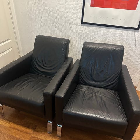 Selger to stk design lenestoler. Kjøpt sommer 2023. Ingen synlige merker, lite brukt. Brunt/mocca, ekte skinn. Kjøpt på Nova Solo for 11.999,- tilsammen. Knotter / «sokk» på alle 4 ben er kjøpt separat for å bevare gulvet.