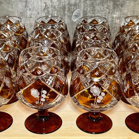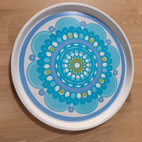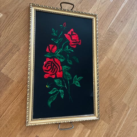 Serveringsbrettet, som er fra -50 tallet, har håndtak og kant rundt i « gull «. Det har tidligere hengt på vegg, og har normal pen bruksslitasje. Det er brukt snor festet i håndtak for veggheng. Det ville sikkert blitt penere med øyeskruer til feste av snor. Glasset kan nesten se litt krakelert ut, men det er helt og i orden.