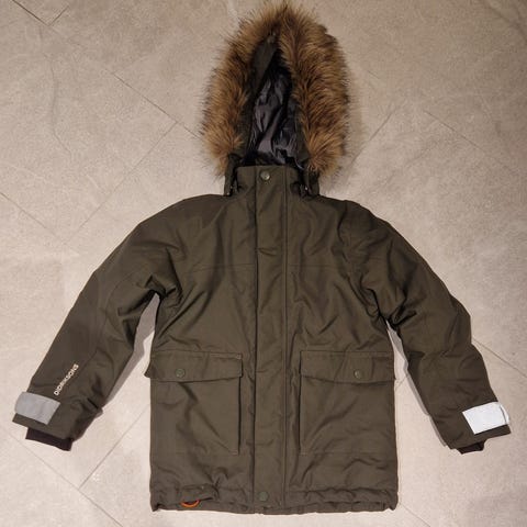 Mørk grønn vinterjakke fra Name-it selges. Avtagbar hette og pels. Str 116. NB: Sømmen på høyre lomme har raknet, se bilde, men det kan sys.