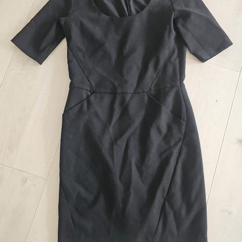 Superfin svart Filippa K kjole med litt kortere armer (litt over albuen). Deilig og myk og ha på, figurnær, like fin til hverdags som til fest. Kan ha en genser over også og da blir det som et lekkert skjørt. 70% viskose, 25%polamyd, 5% elastan.