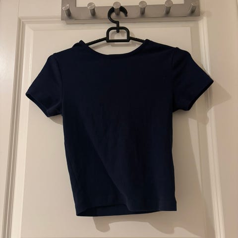 2 stk T-skjorte med hals i ribbet materiale, str XS. Materialet er veldig stretchy, og former seg etter kroppen. Ermene går ned til rett over albuen, og halsen er medium høyde. Farge: marineblå og lyserosa. Fra ginatricot. Lite brukt. 80 kr for begge.