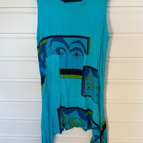 Ny strandkjole str m - kjempegod å ha på. 100% polyester. Perfekte syden tilbehør. Stroppene kan reguleres, alt etter hvor sid du vil ha den. Jeg er 167, den rekker meg midt på låret