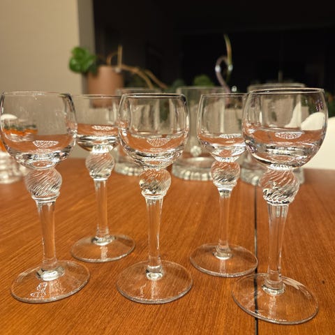 Selger flotte konjakk og hetvinglass fra Holmegaard. Meget pene og uten skader. Har 12 stk konjakkglass høyde 13cm og maks diameter 8 cm. Har 10 stk hetvinglass høyde 14,5 og maks diameter 6,5 cm. År stk kr 50.- . Kom gjerne med bud.