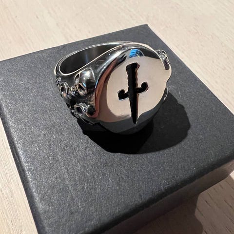 Tinn skull-ring som er sølvbelagt. Ringen er fra merket Amigaz. Den er ny, men har ikke lapp.