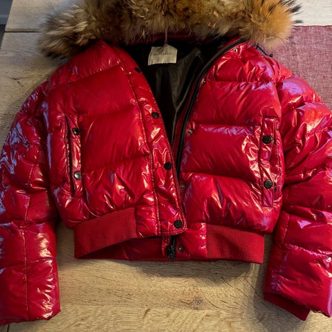 Retro/vintage boblejakke/skijakke med pelskrage der kan tages af og på, i svart og orange/peach farge. Hetten kan justeres med zip på ulike måder (se bilder). Str M/L. Ses på en M på 180