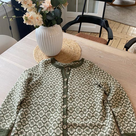 Hjemmestrikket Skappelgenseren i burgunder! Original genseren har inne hals, men denne er strikke på hals og det er ikke splitt nederst! Orginalgensere er på siste bilde!