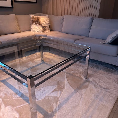 Pent brukt glassbord med ekstra hylle under bordet.