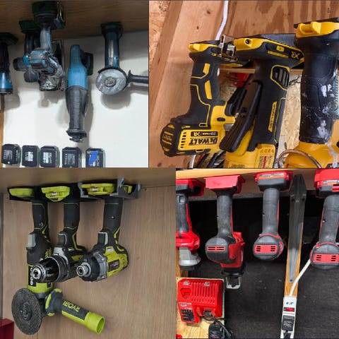 Holderene til verktøy kan enten festes i vegg, eller henge under hylleplater. Printer også holder til sirkelsag, samt batterier.
