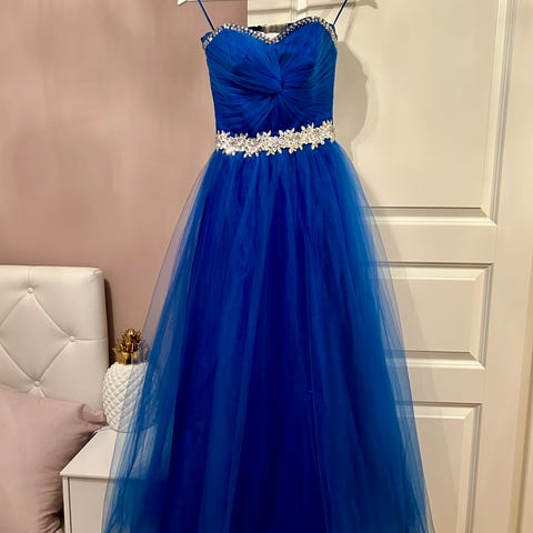 Ballkjole brukt en gang. Kjøpt i San Fransisco. Nydelig i lys lilla, tre lag i skjørtet, se bilde. På bildene ser kjolen rosa ut, men den er syrinlilla. Den er lang, passer med høye hæler til. Snøres inn på rygg til ønsket størrelse. Min modell er en mer small.
