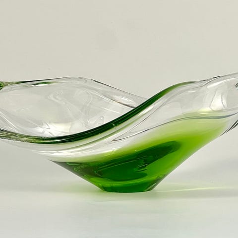 Dette er en eldre glass vinkaraffel med dekorativ virvelstruktur i glasset. Elegant form med smal hals og bred kropp som gir et fint lysspill.