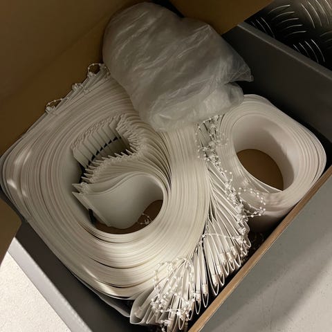 Dette er en gardin skinne som ikke har vært i bruk som er 4820mm lang. ligger inn pakket i en papp sylinder for enklere transport.