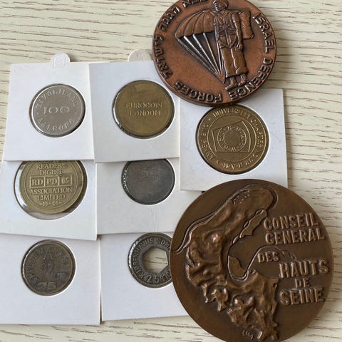 Polletter, noen mynter, medaljer?? Totalt 800 gr. Kjøper betaler porto kr 76.00
