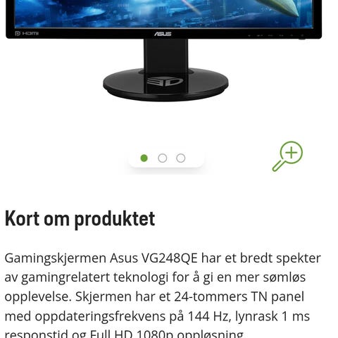 Asus VG248QE har et bredt spekter av gamingrelatert teknologi for å gi en mer sømløs opplevelse. Skjermen har et 24-tommers TN panel med oppdateringsfrekvens på 144 Hz, lynrask 1 ms responstid og Full HD 1080p oppløsning.