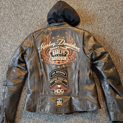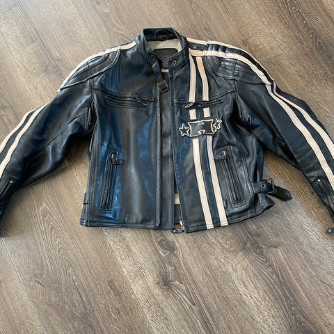 Selger en kul mc skinnjakke til dame, str 42. Har noen merker på ryggen, ellers bra stand.