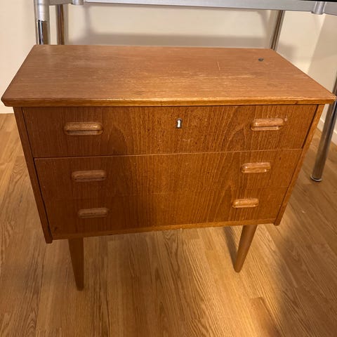 Selger en fin Retro Teak kommode med 3 skuffer en av de med lås. Ett lite bruks merke viser på en av skuffene.