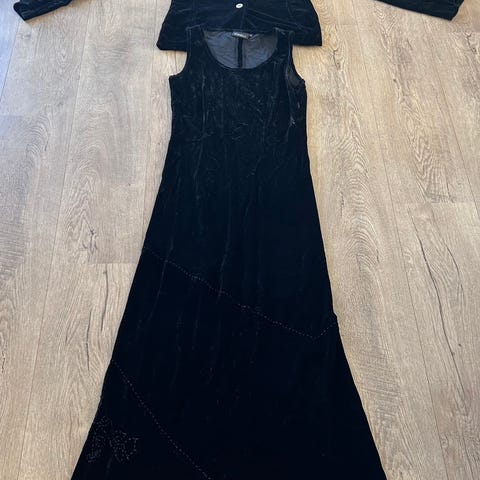 Helt nydelig enkel lang selskapskjole, 2 deler i gråblå fløyel i str 40. Kan vaskes på 40 grader og drypphenge. Kjolen er fra begynnelsen på 70-tallet og bare brukt noen få ganger.