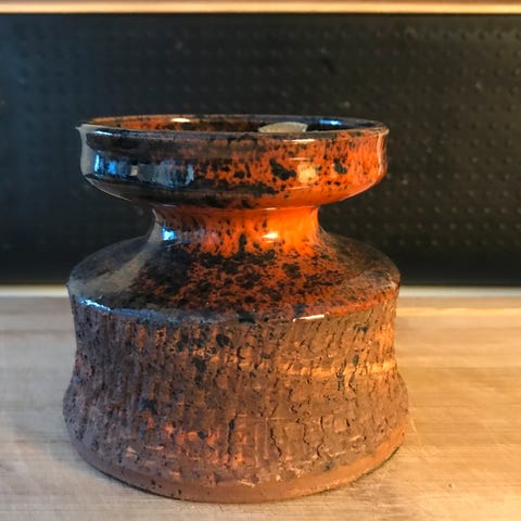 Håndlaget lysestake i blått og oransje fra Ernst Faxe Danmark, merket med nr 36. Høyde er 7,5 cm.