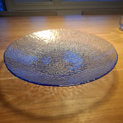 Pent fat fra Hadeland Glassverk. Fatet er 40 cm i diameter og har en blå farge i midten. Sendes ikke