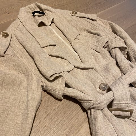 Trench Coat Cilia i en stilig, rett oversize-modell. Krage og blås med lås foran og løst hengende bærestykke både foran og bak. Skulderklaffer og bred helle i ryggen med et belte som har en fin spenne. To innfelte lommer og høy splitt nederst på ryggen. Vevd, kraftig stoff med fin struktur og kraftig fall. Lengde 125cm.