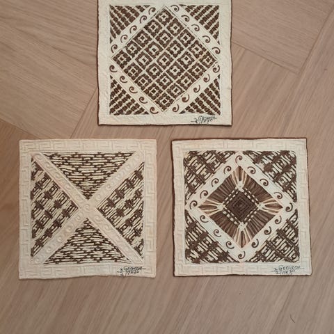 6 broderte servietter 15,5 × 15,5 cm. Antakelig fra før krigen. Kan sendes