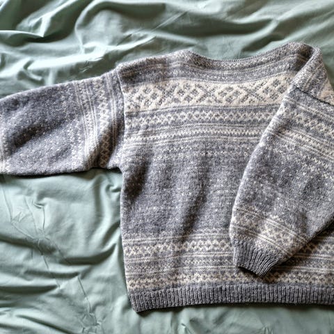 Håndstrikket genser fra 1960 tallet som aldri har vært brukt, lå fortsatt innpakket i papir fra den norske husfliden når jeg fikk tak i den så 100 % strøken. Str S, høyde 56 målt fra midten av hals til nederst på kant . Bredde 48 cm målt fra skjøt til skjøt der ermene er festet til genseren.