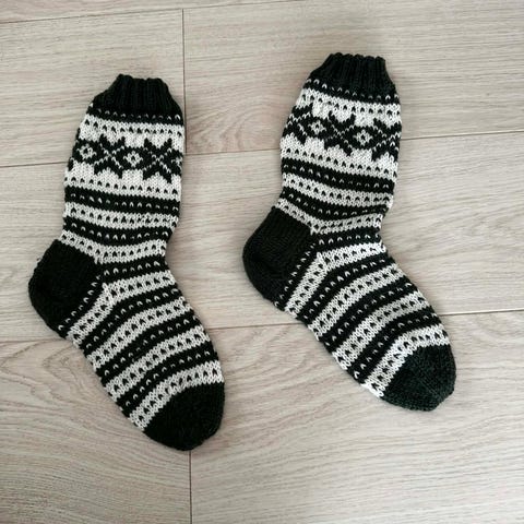 Hjemmestrikka korte ullsokker. Mønster rundt hele sokken