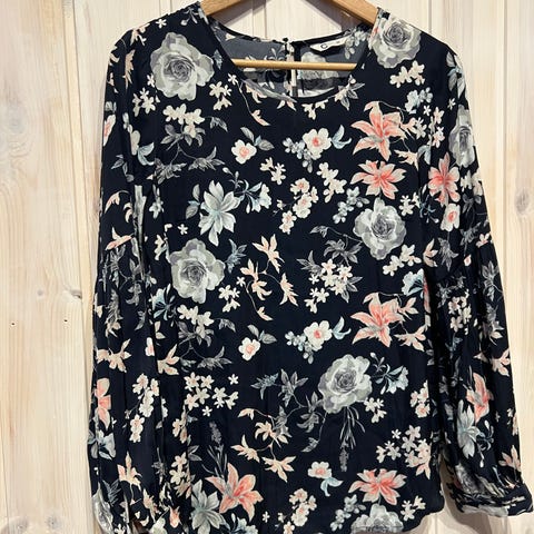 Blusen har små, pastellfargede blomster på mørk bakgrunn og knyting i utringningen. Den er pent og veldig lite brukt.