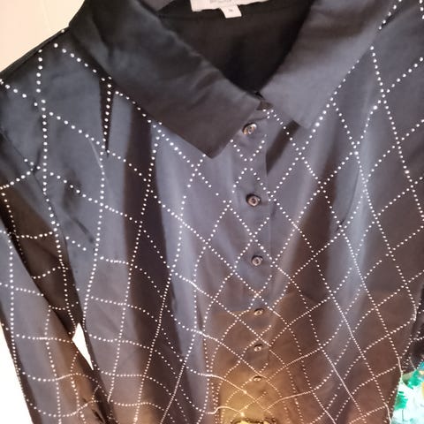Vintage skjortebluse med masse små stjernemønstre og metalliske knapper i sort ✨ Skjorta er transparent, særlig ved kragen og på ermene. Fra vintagemerket Darling, og i god stand. I str L, men muligens mer tilnærma en str M.