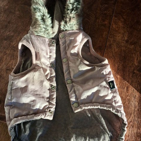 Brukt til vår Whippet da den var valp, passer liten mellomstor hund og regulerbar rundt. En patent knapp har falt av se på bildet, men siden så mange har det ikke så mye å si.