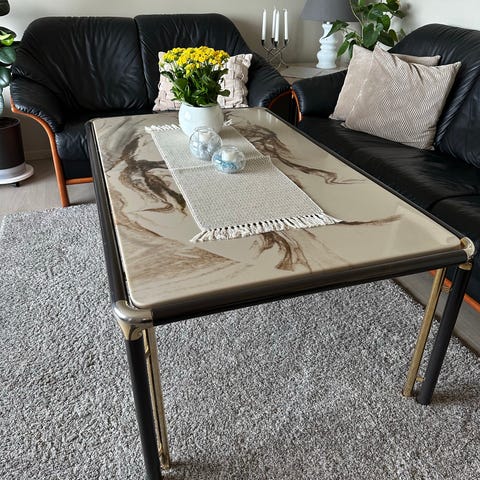 Stilfult sofabord med marmoruttrykk. Tilnærmet samme design som det populære bordet Androgyne Loungebord fra Audo Copenhagen