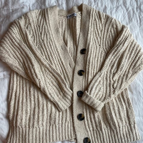 Strikka jakke med fletta mønster - S - selges kr 150. Knapt brukt, romslig i størrelse så passer fint M også.