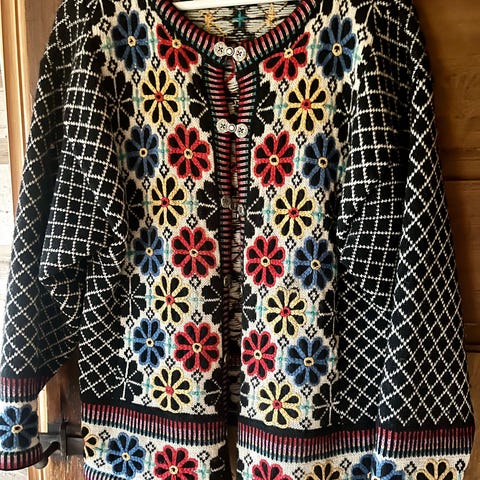 Lett vattert jakke med lommer. Festes med knapper foran.