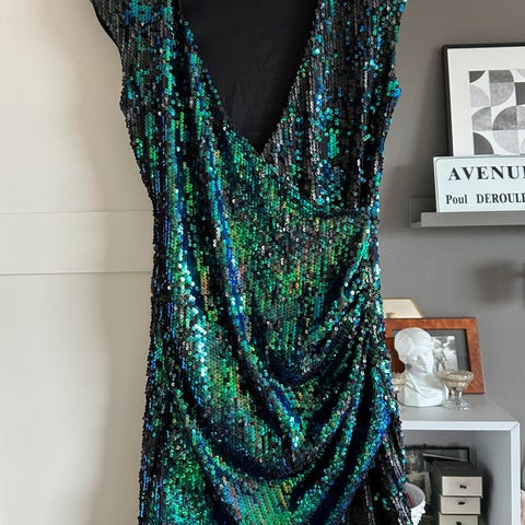 Meget pen kjole fra Miss Selfridge. Størrelse 34. Foret. Brodert og paljetter. Innsvinget. Glidelås bak. Nylon/ polyester. Lengde fra overkant skulder til skjørtekant ca 85 cm. Omkrets under armer ca 75 cm, omkrets liv ca 65 cm.