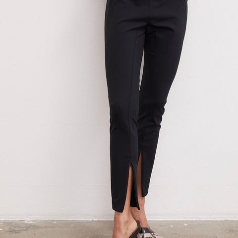 Cool modell med slim fit design, medium høy og elastisk midje (lukkes med glidelås og knapp på siden). Korte splitter ved ankler.