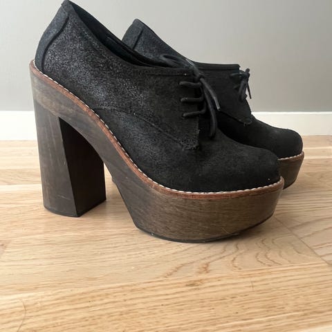 Orginale platåsko i str 38. Behagelig å gå med . 10 cm hæl høyde,noe slitt på tuppen, men rett skopuss fikser det.