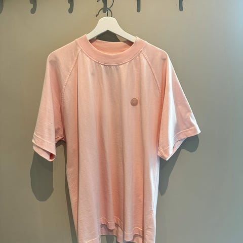 Det er en oversized T-shirt i myk bomullstrikot med ribbestrikket kant rundt halsen og lav skuldersøm.