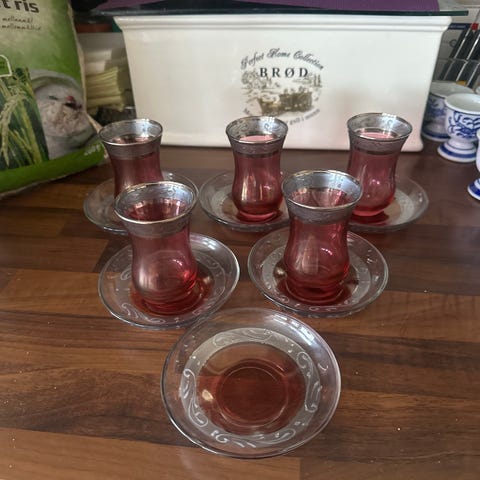 Har 4 glass og asjett til Tyrkisk te. Godt brukt og endel av gullet på glassene og asjettene er borte. Se bilder. Pluss 4 små skjeer , hvor den ene er stygg.