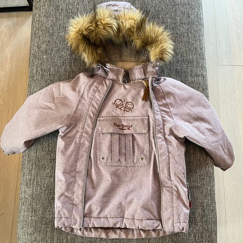 Selger en vinterjakke fra Tiny trolls of Norway i str 98. Den er nok litt stor i str. Er avtagbar fuskepels, refleksdetaljer og glidelåslommer. Den har litt bitemerker øverst på jakken, selges derfor billig. Fargen er litt rødlig burgunderaktig. 70kr