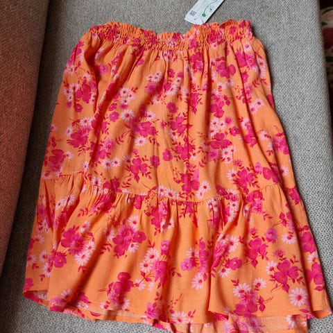 Rosa blomstret skjørt med dekorknapper i linningen foran. Foret.