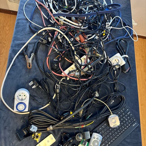 Overskudd av el kabler(norsk). Brukt til dataskjermer, datamaskiner etc..