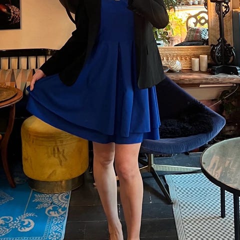 Selger en penkjole som skreddersydd i utlandet. Ca str S. Måler flatt 35 cm over brystet, lengde ca 80 cm. Glidelås i ryggen. Stilig hals. Fargen er svart/veldig mørk blå med en rosa stripe.