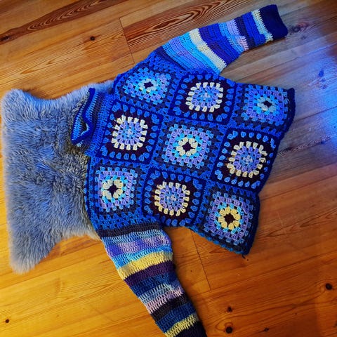 Blå hekla genser med hjerter. Selges for prisen av garnet da den ble litt liten.