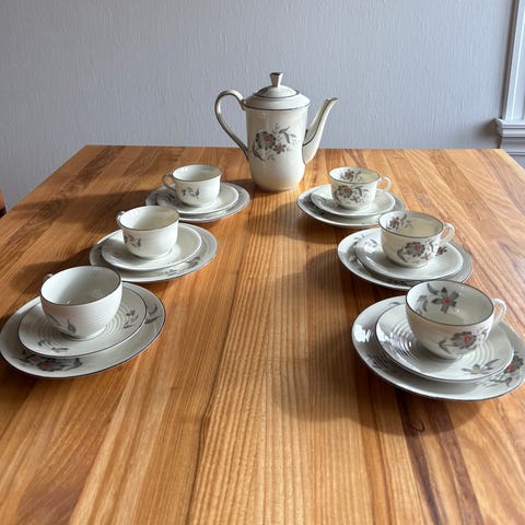8 moccakopper med skål, samt kaffekanne. Selges for kr. 100.-
