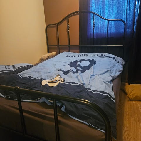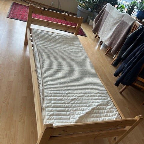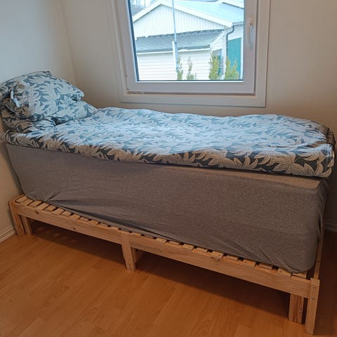 Meget fin og kul jernseng, selvsagt med bunn, madrass og overmadrass.
