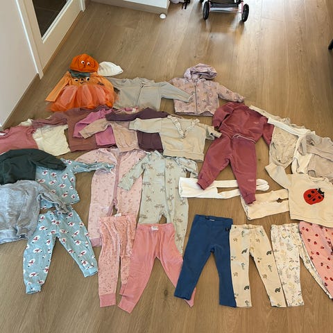 Klespakke i str 62. Pent brukt. Noen omslagsbodyer.