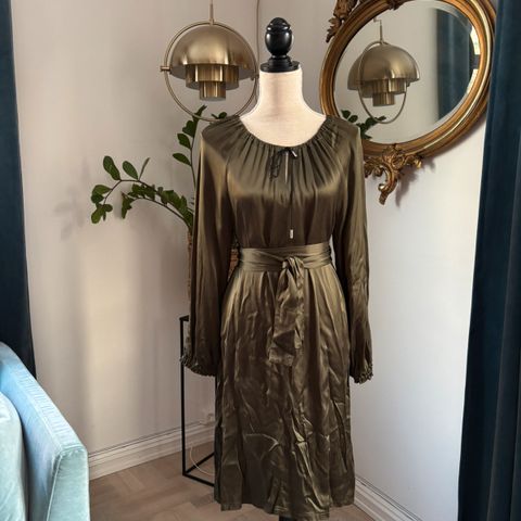 Overdelen er i viskose -jersey stoff med stretch (creamfarge) og skjørtet er i 100% silke (sølv/ grå)