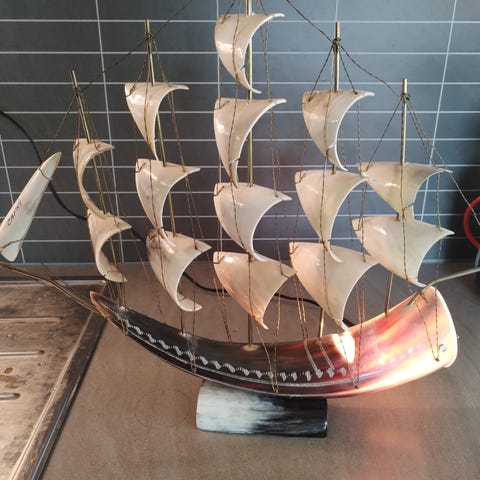 Den er 95 cm lang og 115 cm høg. Ei sprekk på langs i bunnen av båten. Med ror som kan beveges med rorkulten.