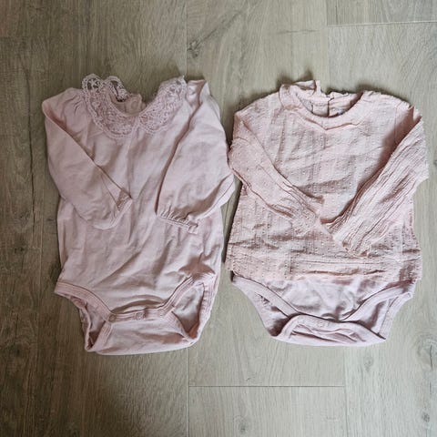 Omslagsbody med jordbærmønster i str. 67 fra Petit Bateau og cardigan med omslag i str. 68 fra Zara. Plaggene er noe små i størrelsen. Nypris ca. 450 kr