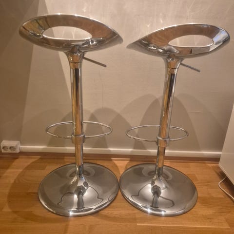 To hvite barstoler med sving, justerbar høyde og 360 graders rotasjon, i god stand.