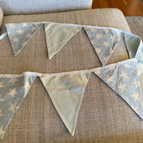 Helt nye, hjemmesydde vimpler/flaggbanner/girlander som passer flott til barnerommet, f.eks. over senga, eller for å spre litt ekstra glede ved bursdager.